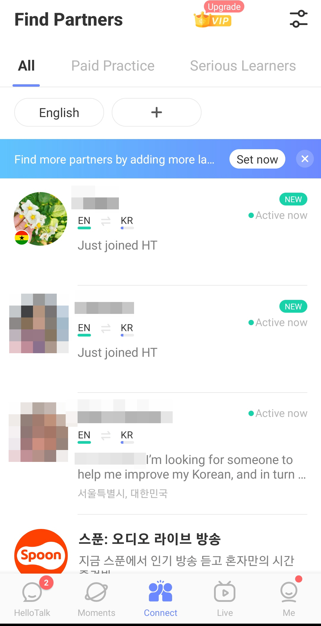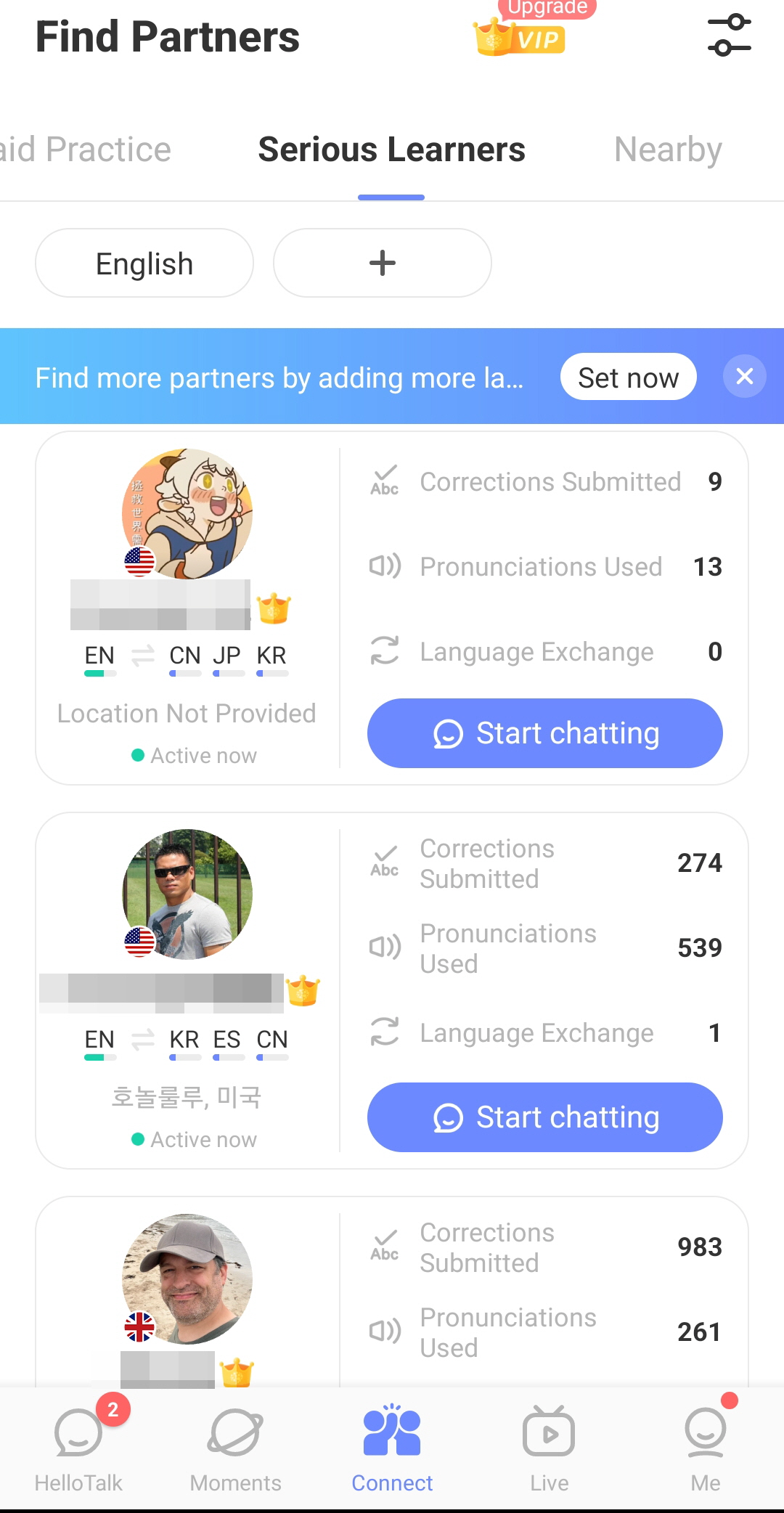 One who really wants to learn and study languages, can check those on the Find partners page and look at paid practice, serious learners, or others. Paid partners can pay the user with HelloTalk's virtual item, the coin, and get lessons and teach. Or serious learners, who are literally study partners for certain languages.