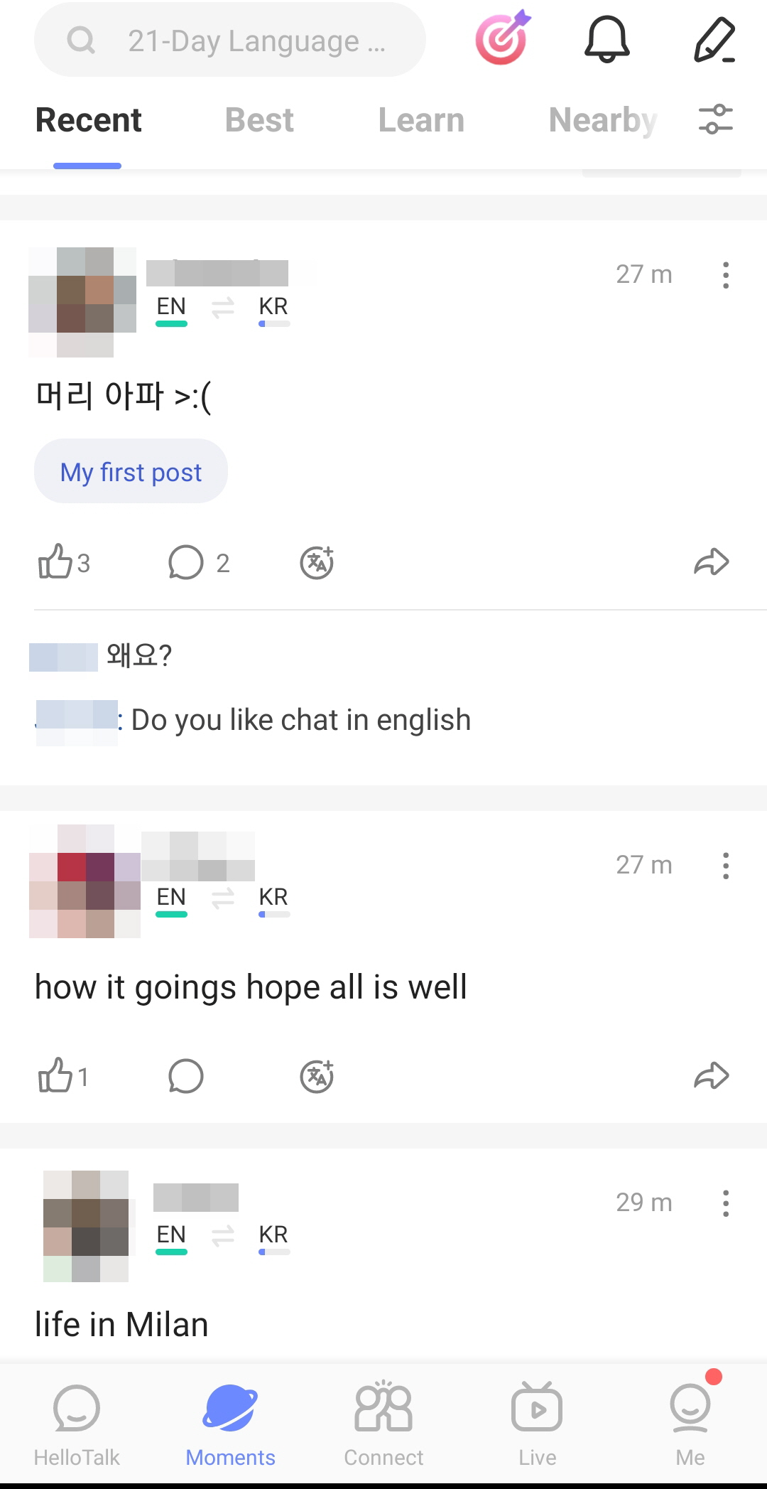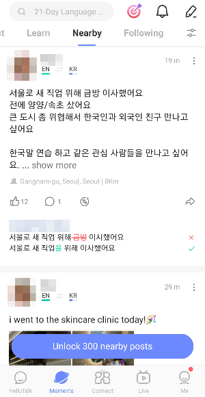 This is the Moment page and has various menus for checking lists and posts by user's preference, I felt that HelloTalk has put more effort into it because it is not a free post with everything with any gossip and normal daily life with chat up with a storm, but even in a single post user can make correction each for the right use of certain languages, so users and viewers can learn and study more about languages with better use.